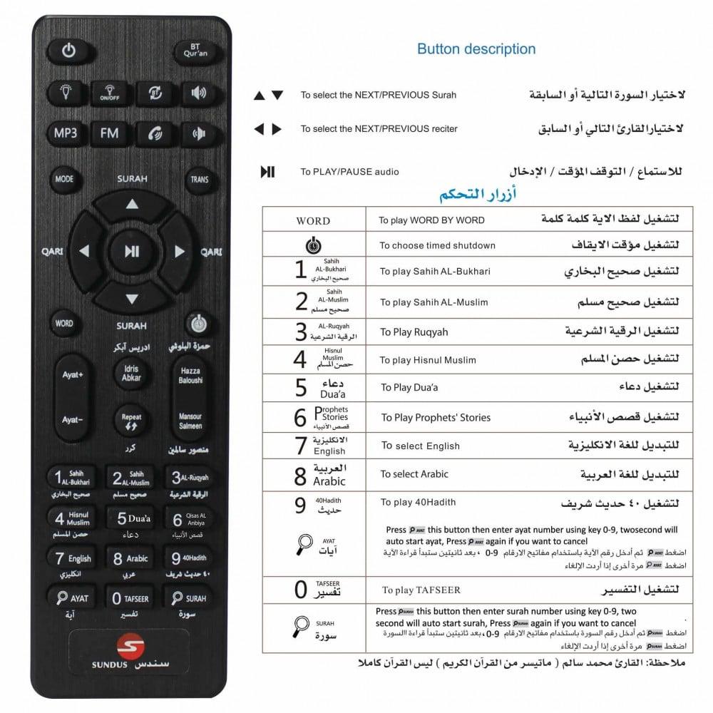 -يحتوي على القرآن كاملا حيث يمكن التنقل لاختيار السورة وصوت القارئ بالريموت والتحكم بدرجة الصوت