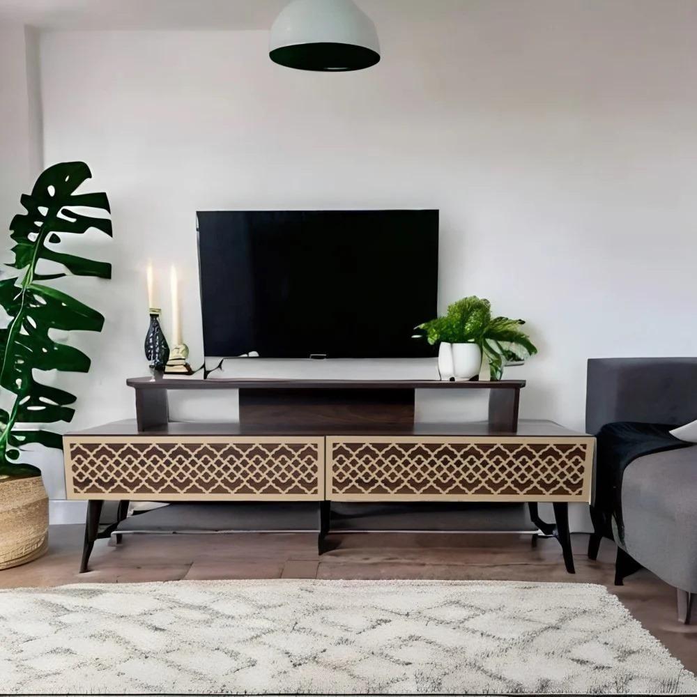 طاولة تلفزيون خشبية بتصميم هندسي وأنيق , مصنوعة من الخشب الماليزي بجودة عالية , قوي ومتين وشديد التحمل , من الديكورات الجميلة والمناسبة للمنزل .