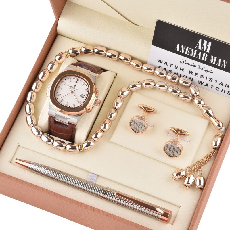 طقم رجالي تصميم باتك فليب مكون من :-ساعة . قلم . كبك. سبحة . علبه فخمة جلد طبيعي الميزات الأساسيةطقم مصمم لإضفاء لمسة شخصية متكامله على إطلالتك من خلال احتوائة على ساعه وكبك وسبحه ولقلمالساعه مصممة بخاصية مقاومة الماء لتوفير السلامة المثالية للساعة وايضا مثبتة بدقةٍ بسوارٍ من الجلد يضمن حركةً مريحةً للمعصم الكبك مثالي لحفلات الزفاف، الاجتماعات، الحفلات أو أي مناسبات خاصة أخرىيوحي بالأناقة المطلقة مع جاذبيته الحضريةهيكل متين ويدوم طويلا