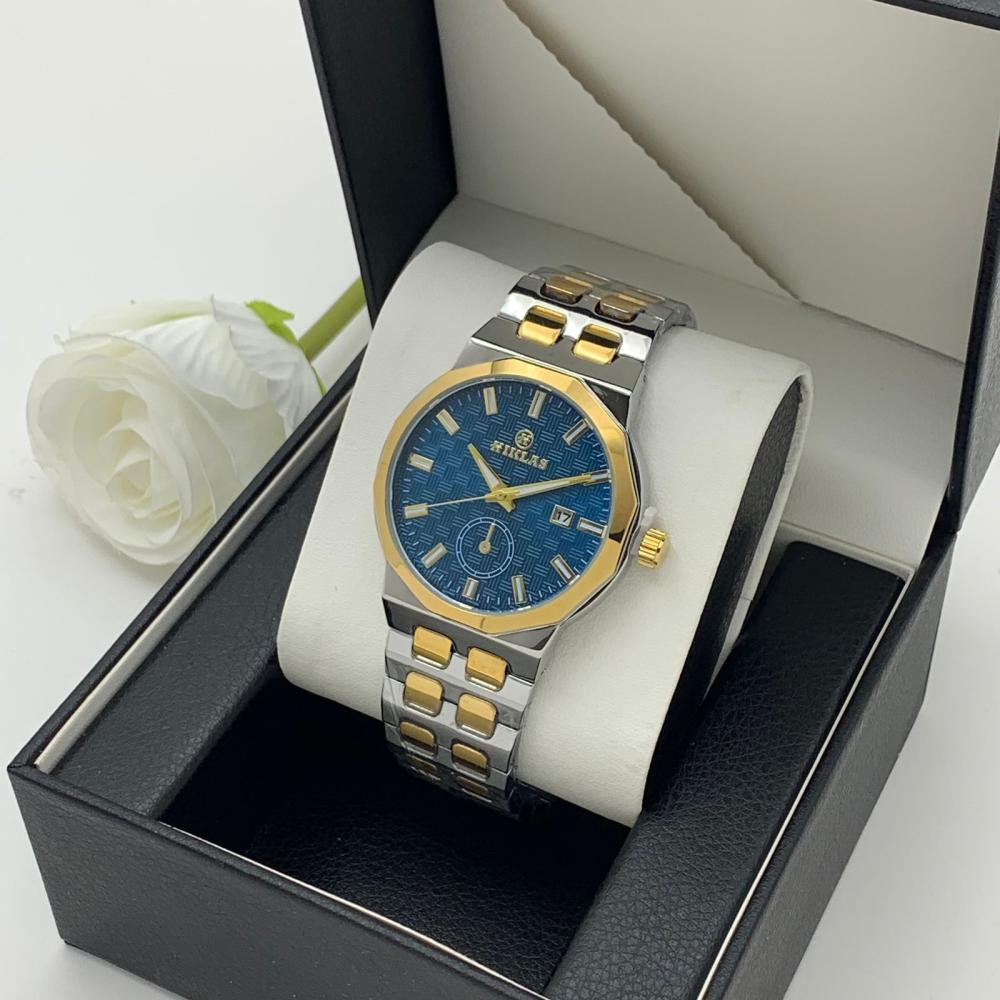 ساعة رجالية جذابة بتصميم رائع بسير من الستانلس ستيل ذهبي مع فضي وميناء ازرق 678548