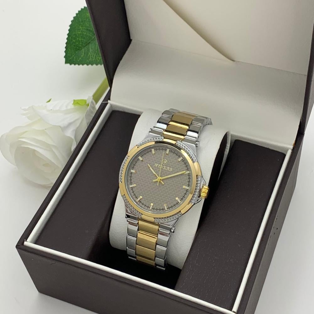 ساعة رجالية صغيرة جذابة بتصميم دائري رائع بسير من الستانلس ستيل ذهبي وفضي وميناء رصاصي K45719
