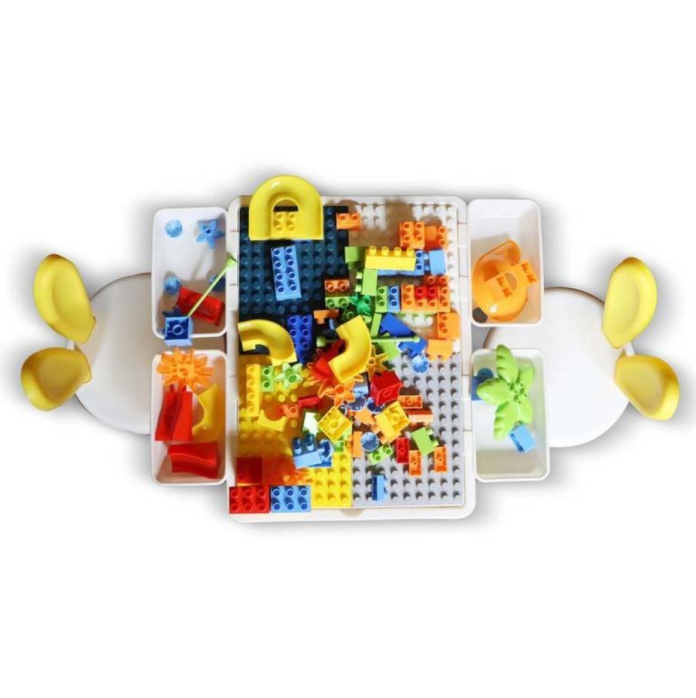 • سطح تفاعلي للإبداع: يتميز سطح الطاولة بفتحات ذكية لتثبيت المكعبات، مما يتيح لأطفالك بناء وتشكيل عالمهم الخاص بأشكال وألوان لا حدود لها.