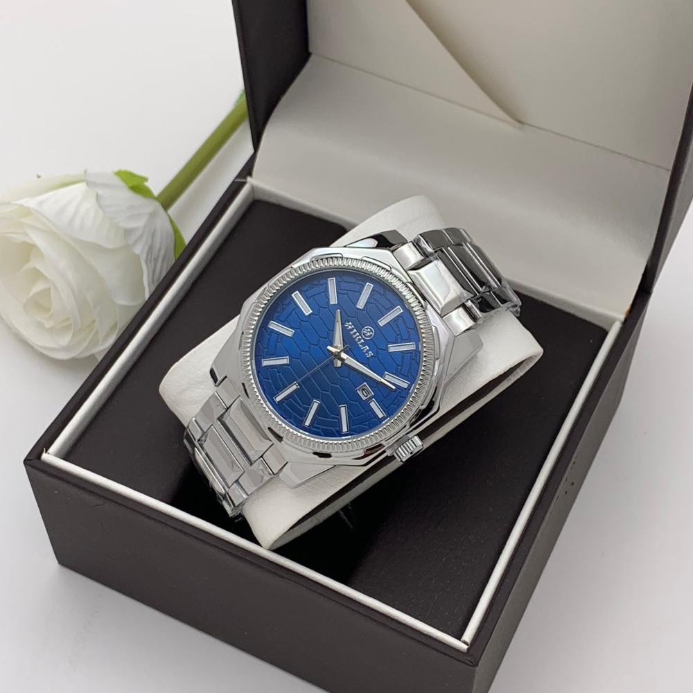 ساعة رجالية جذابة بتصميم دائري رائع بسير من الستانلس ستيل فضي وميناء ازرق مقمش K45700